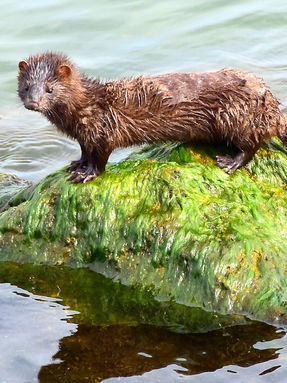 American mink, relatives of otters and beavers, have long slender bodies that are around 2 feet in length. Their short legs have semi-webbed toes, helping them to be excellent swimmers. These mink have dark glossy fur usually with a patch of white under the chin. American mink are solitary and therefore most often seen alone.